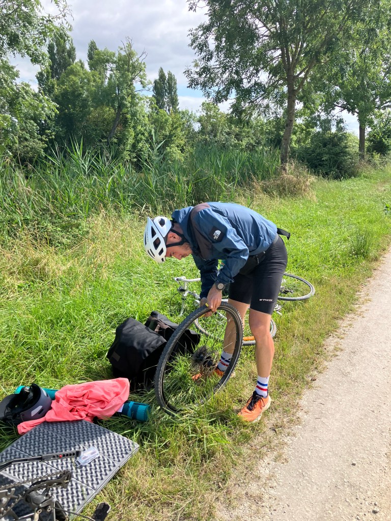 Il reste un peu moins de 20km, ça défile bien, on devrait être dans les temps pour se poser dans un bar et regarder le 1/8ème de finale de l’Euro de Football qui oppose l’Equipe de France à nos amis Belges. Mais quand je vous dis que dans un voyage il y a toujours des péripéties… En me retournant, j’aperçois Ambre qui me fait des grands signes : elle vient de crever sur le pneu arrière. Là je passe en mode mécanicien façon tuto de Jérôme Niel (pour ceux qui on la référence…).