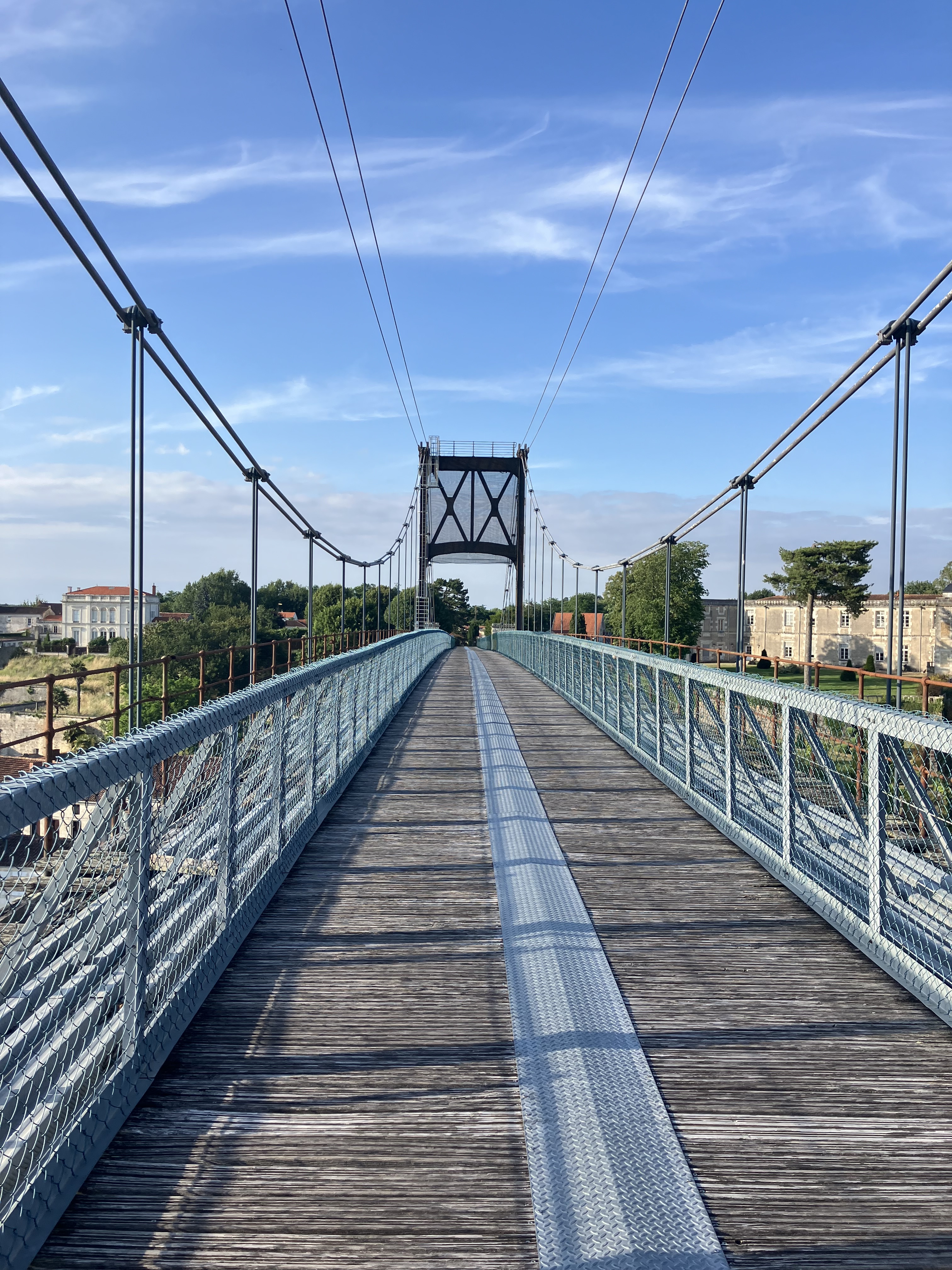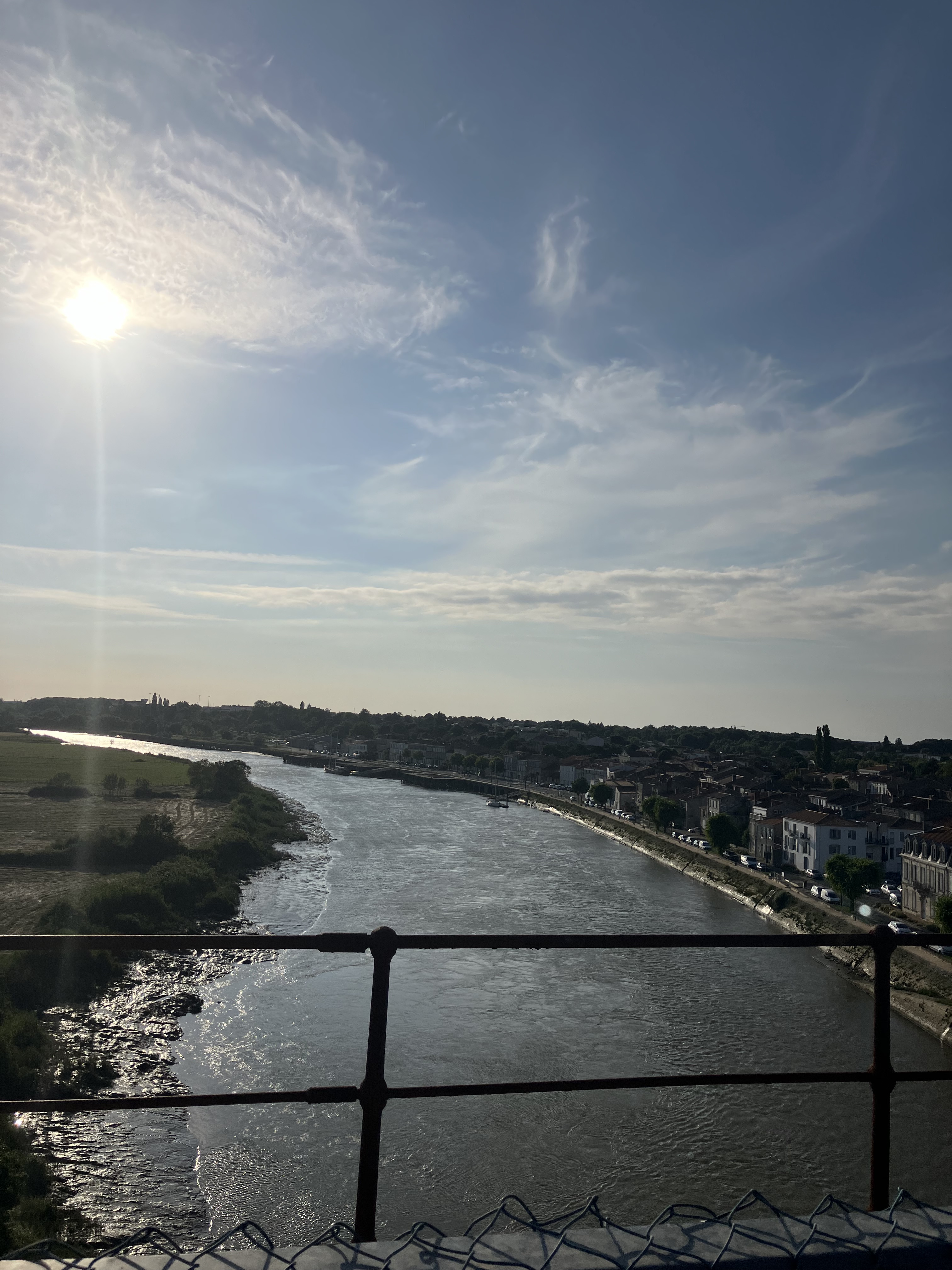 La fin de la journée commence à être longue, on se demande même si on va pas raccourcir le trajet. Nous temporisons en allant acheter notre repas du soir puis nous nous motivons à effectuer les derniers kms. Il nous reste à traverser le pont suspendu de Tonnay-Charente. En voyant la route s’élever, on se demande pourquoi on s’inflige ce genre de choses et puis on se rend compte de la beauté du paysage donc on relativise très rapidement en suivant.