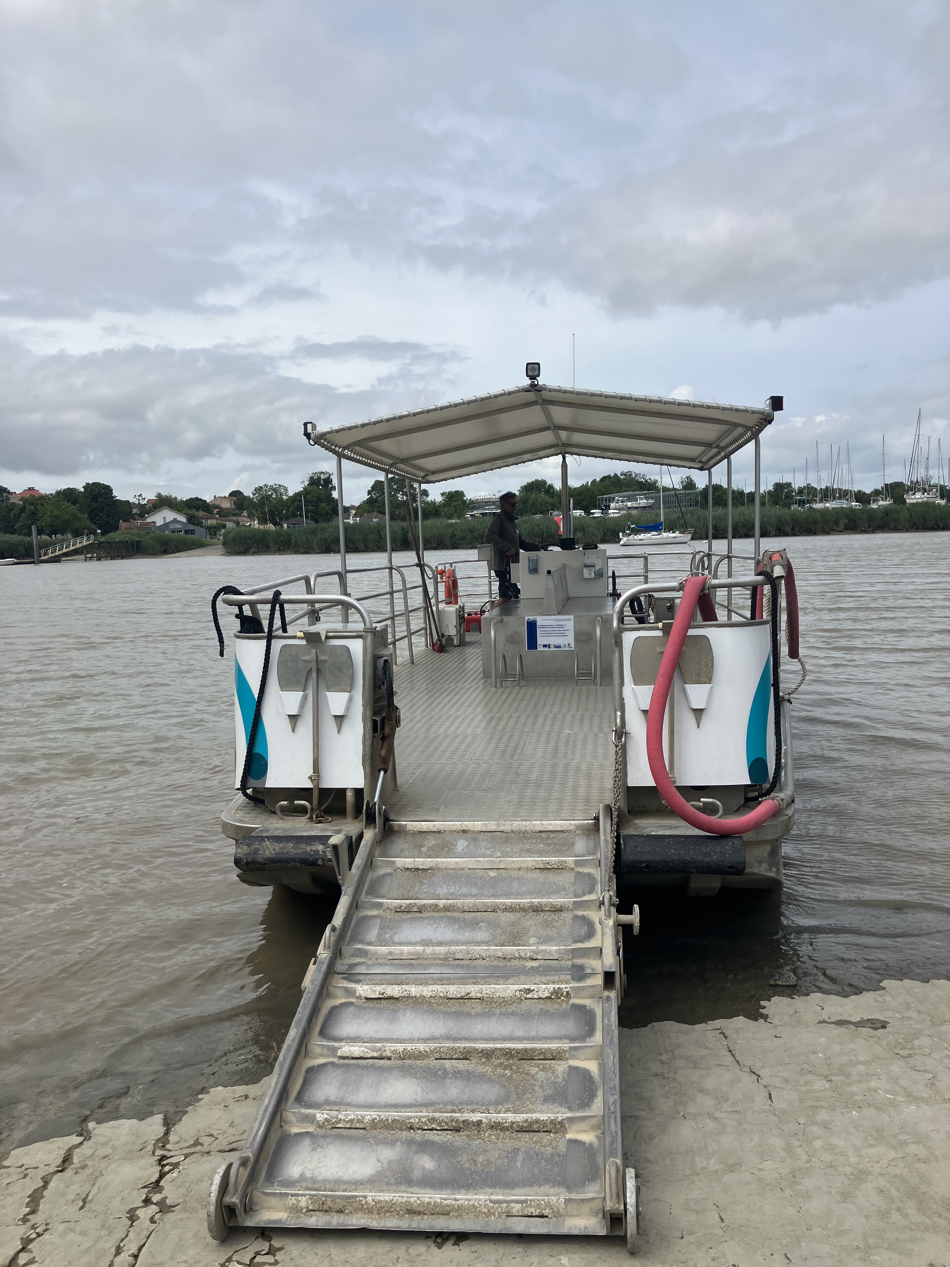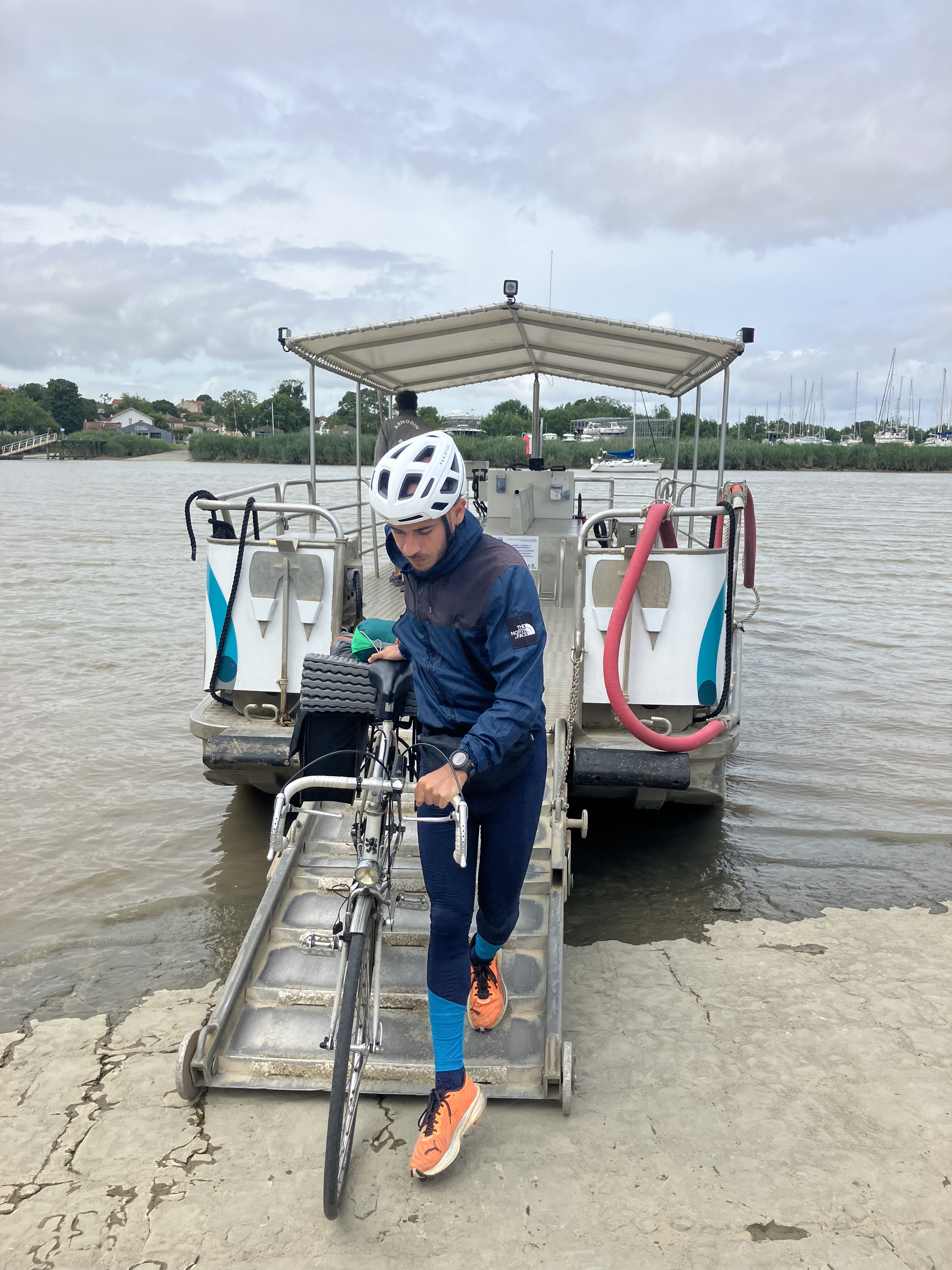Vous vous souvenez des 2€ donné à un homme à Hourtin ? Bingo ! C’est pile la somme qui nous manque pour pouvoir payer la navette fluviale qui n’accepte que la monnaie. Me voila reparti sur le vélo pour trouver le seul et unique guichet qui distribue de l’espèce dans cette ville. Après un peu plus de 2km en mode contre-la-montre, je me dépêche de retirer de l’argent puis de regagner la navette. Nous traversons pour la deuxième fois de la journée la Charente et on espère juste que toute la journée ne sera pas aussi mouvementée sinon ça risque d’être long 😄