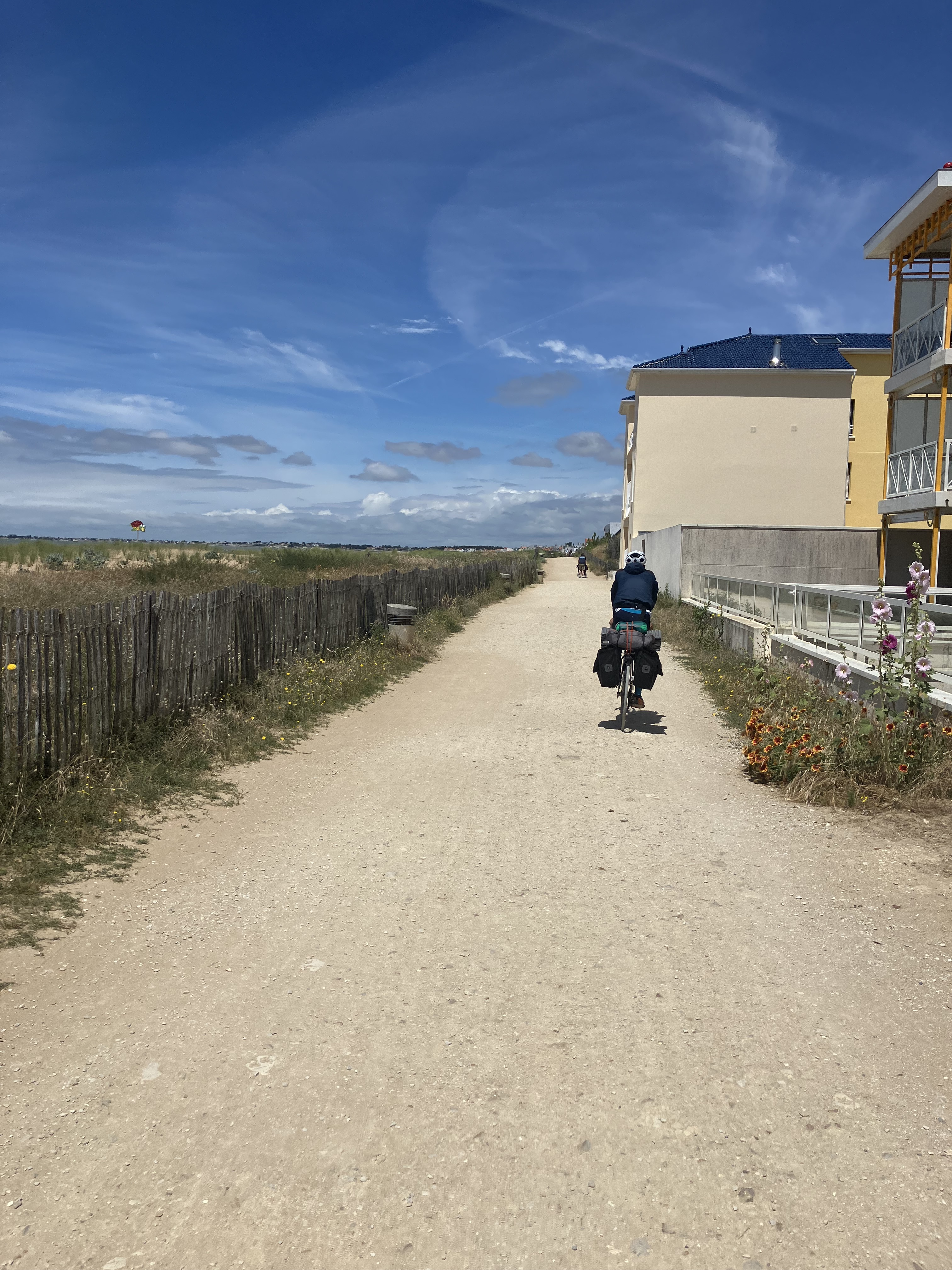 Le vent est toujours présent et n’a pas changé de direction. Depuis le début du périple, nous nous faisions la réflexion de ne croiser que des gens dans le sens inverse. On commence à croire que nous sommes les seuls cyclistes de la Vélodyssé à partir du Sud pour rejoindre le Nord. Mais dès le début de cette journée, nous croisons une dame qui à l’air d’utiliser la Vélodyssé dans le même sens puisqu’elle est aussi chargée que nous et que nous allons nous suivre sur plusieurs kms (ça sera la seule et unique personne qu’on croisera dans le même sens que nous durant ce voyage…). On se rassure comme on peut 🥲