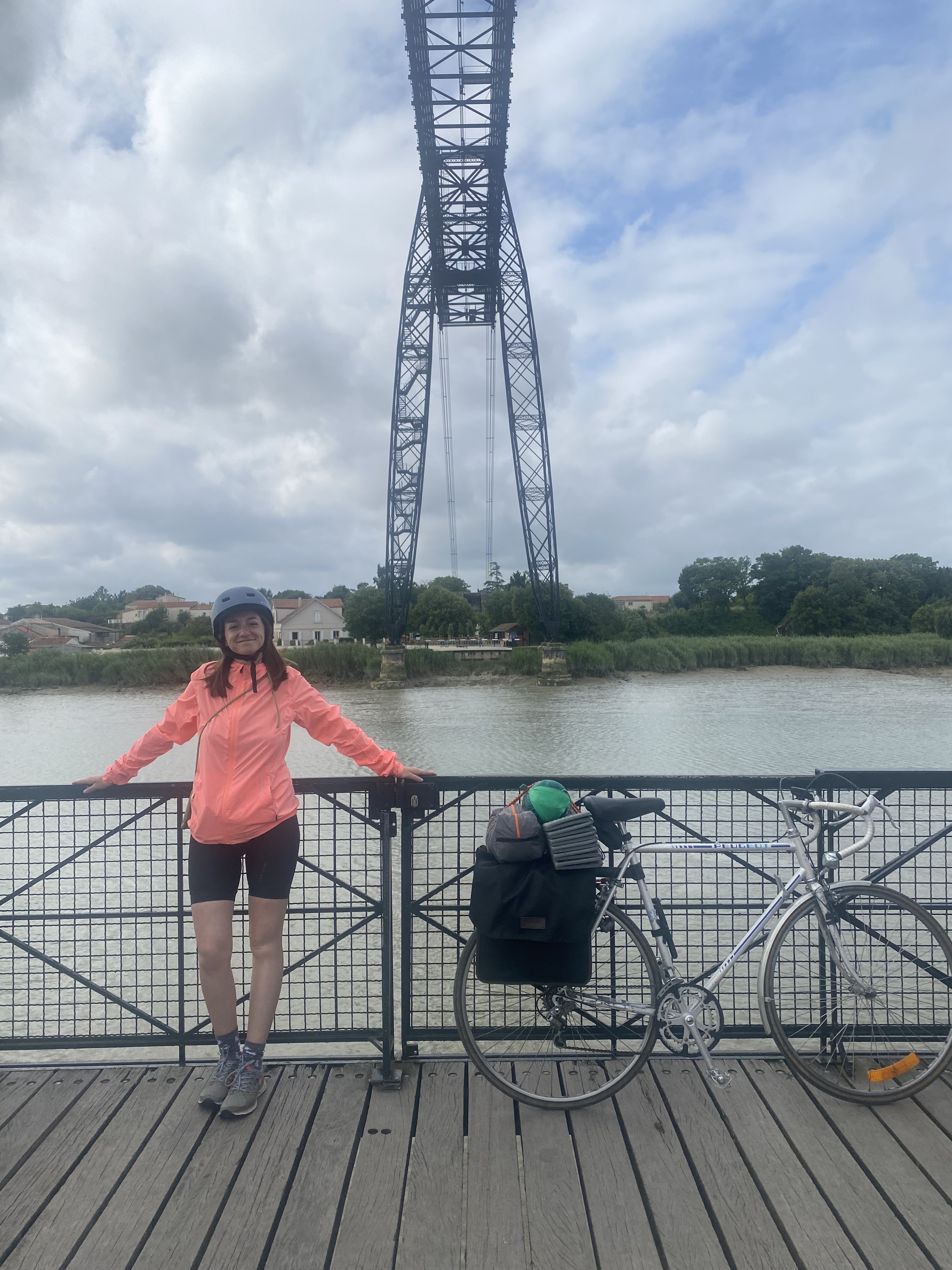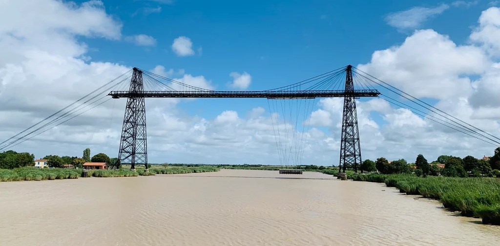 Après 10km de vélo, nous sommes en train de contourner la ville de Rochefort en longeant la Charente, nous apercevons une immense structure métallique qui fait passer les piétons d’une rive à l’autre : c’est le Transbordeur !